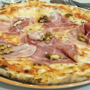 Base Margherita, gorgonzola, pancetta coppata, noci, miele